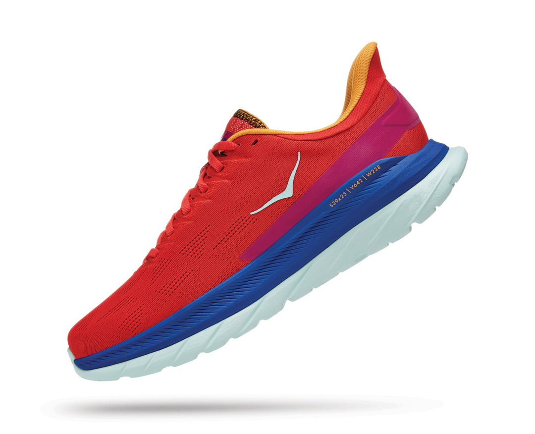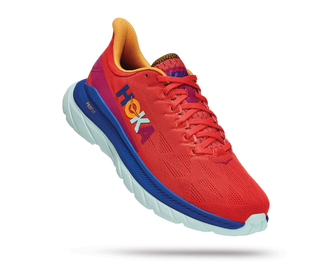 In its fourth edition, the Mach 4 takes its biggest leap forward, built on themes inspired by the Rocket X and Carbon X. Designed for logging long miles, this everyday trainer delivers a lively ride and energetic underfoot feel that is unquestionably HOKA. Softer and bouncier than the previous iteration, the Mach 4 employs a harmonious blend of foams — merging an incredibly soft, lightweight foam on top with rubberized foam directly beneath. This up-tempo shoe has been crafted with a new pull tab, revamped upper made from heat pressed TPU embroidered yarns, and a refined collar shape that alleviates pressure on the Achilles. Light, fast and unquestionably responsive, the Mach 4 delivers a daily dose of speed.