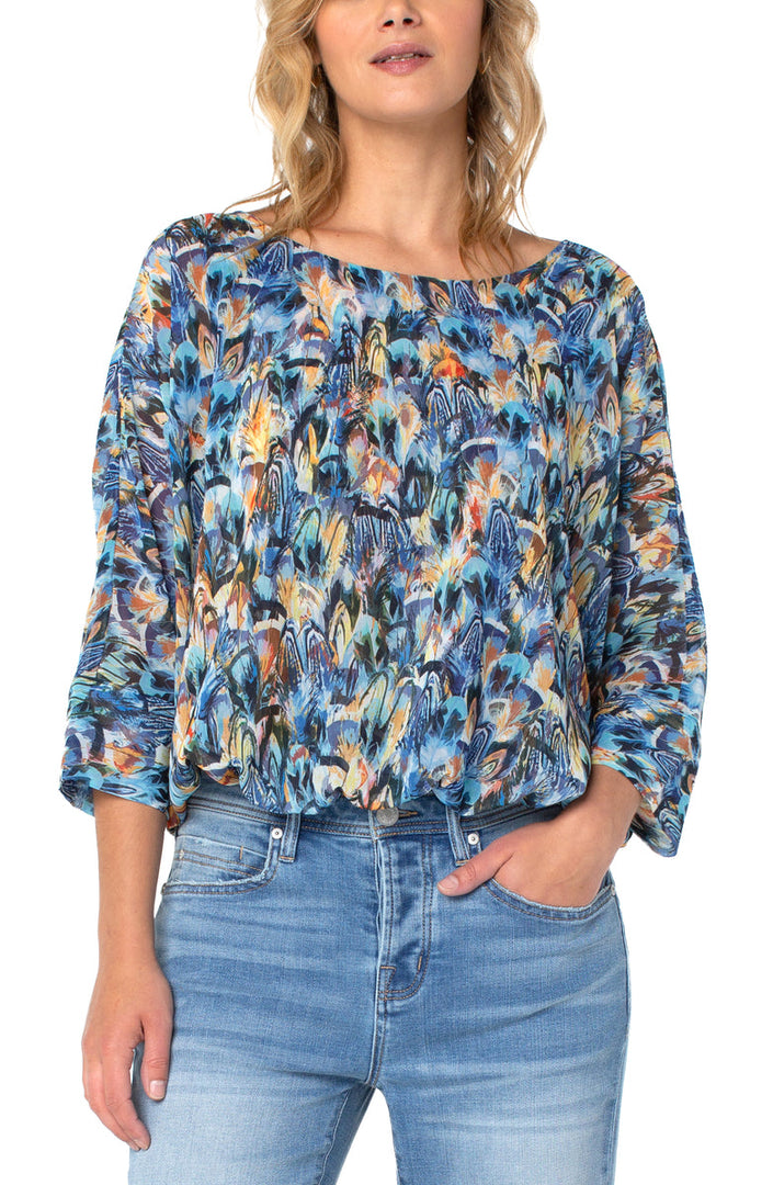 Make a statement in this gathered hem dolman tie back top in a beautiful painted feather print. Perfect for brunch or special occasions.