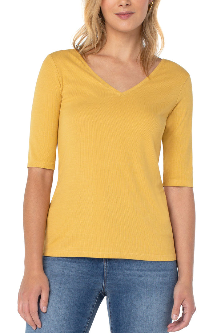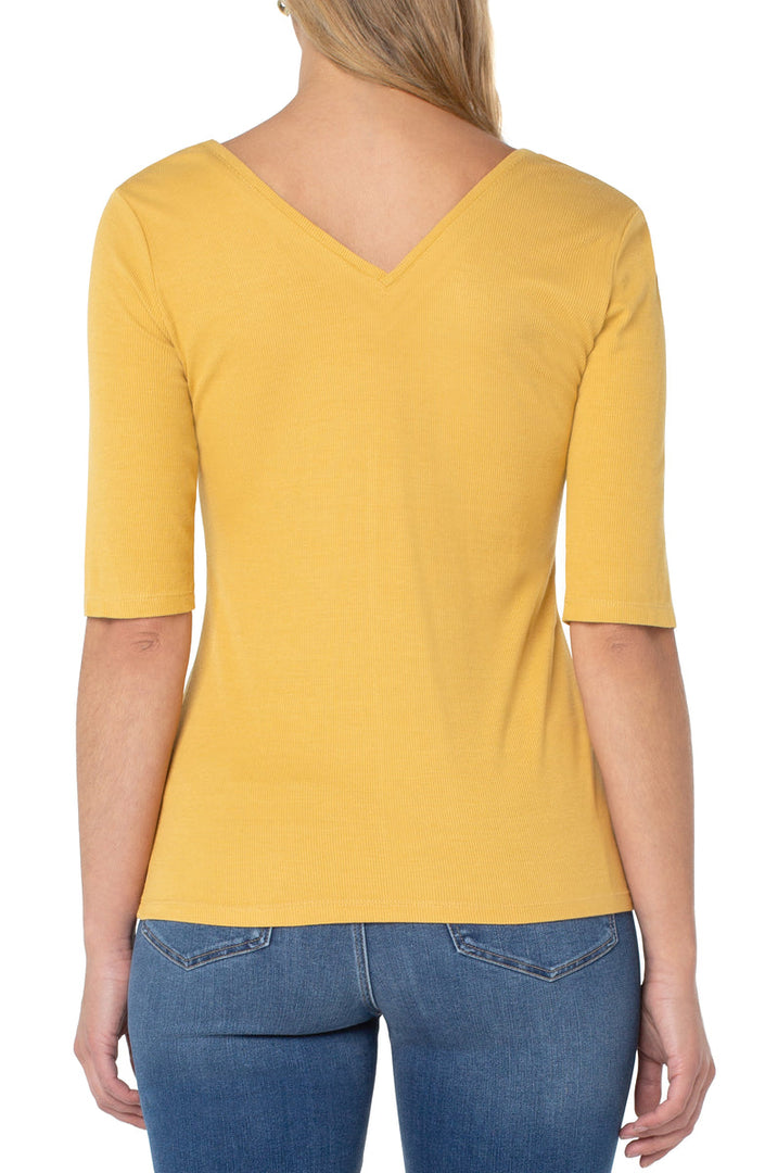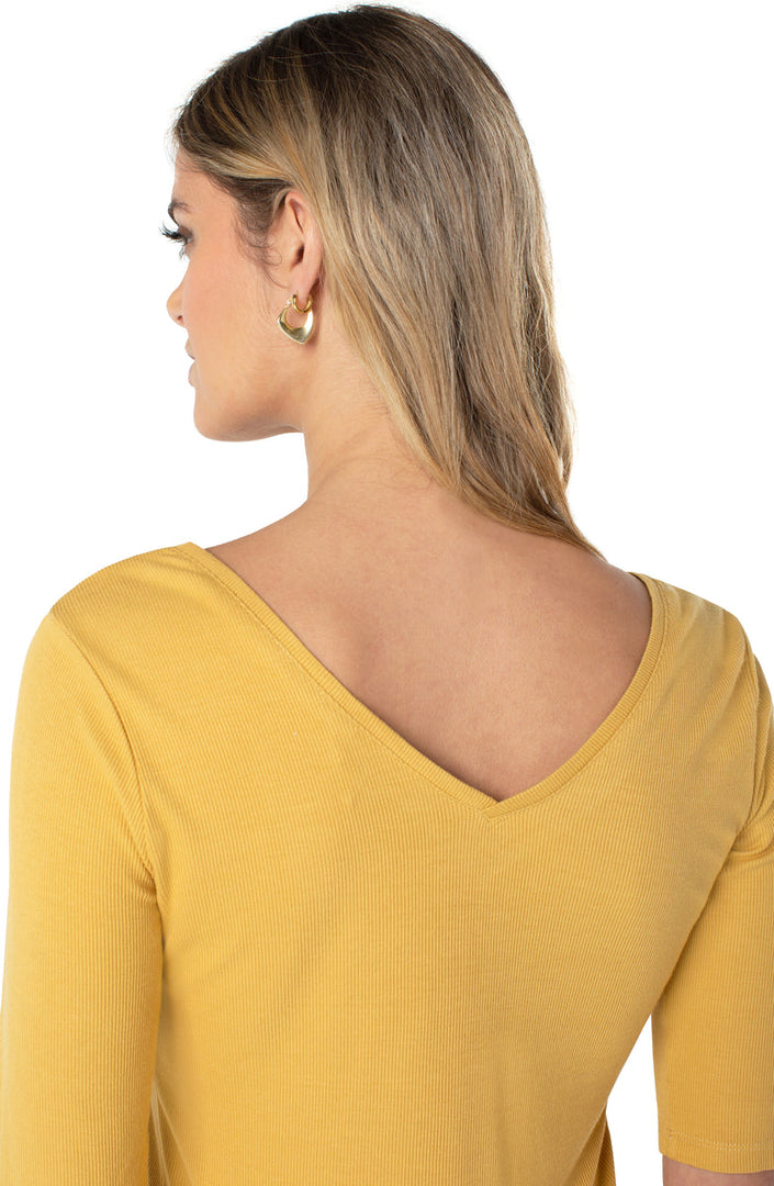 This beautiful top features not one, but TWO V-necklines. The double v-neck detailing adds some intrigue to a classic tee! Dress it up with a trouser or pair it with denim!