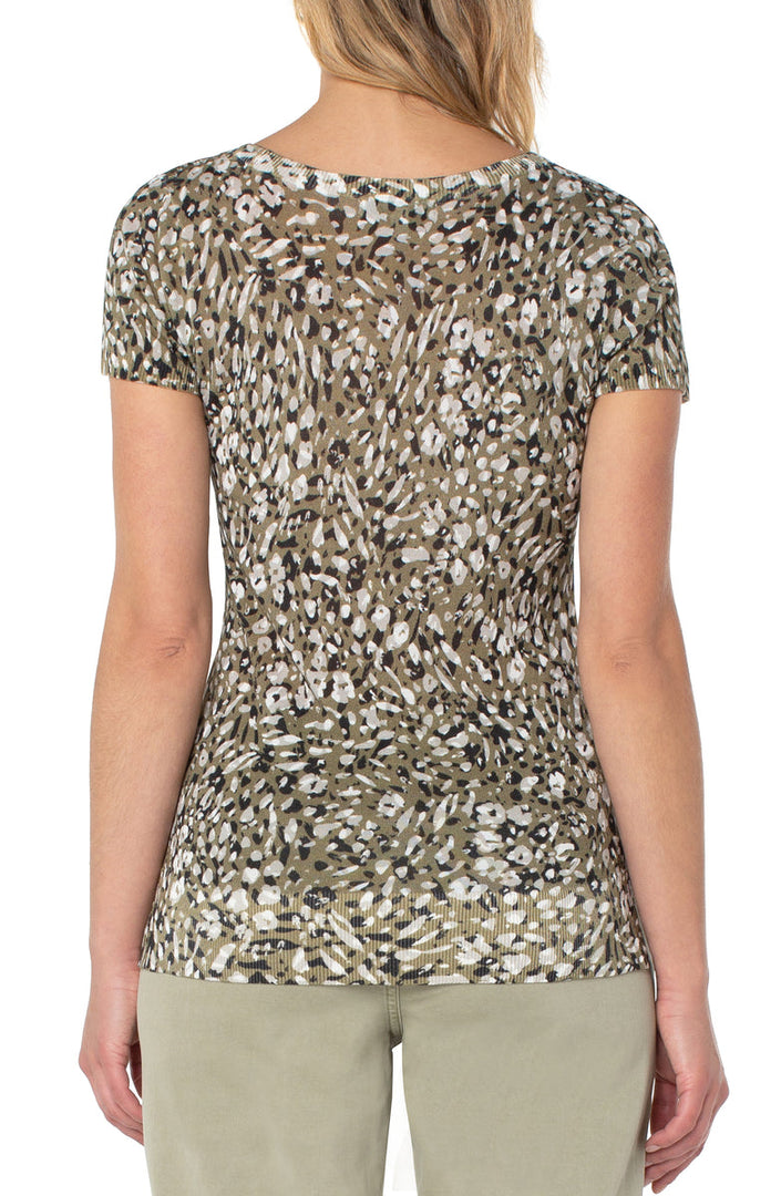 The unique short sleeve scoop neck every woman needs! Featuring a beautiful painted animal print, this knit is the perfect addition to any wardrobe. Pairs with denim or trousers effortlessly.
