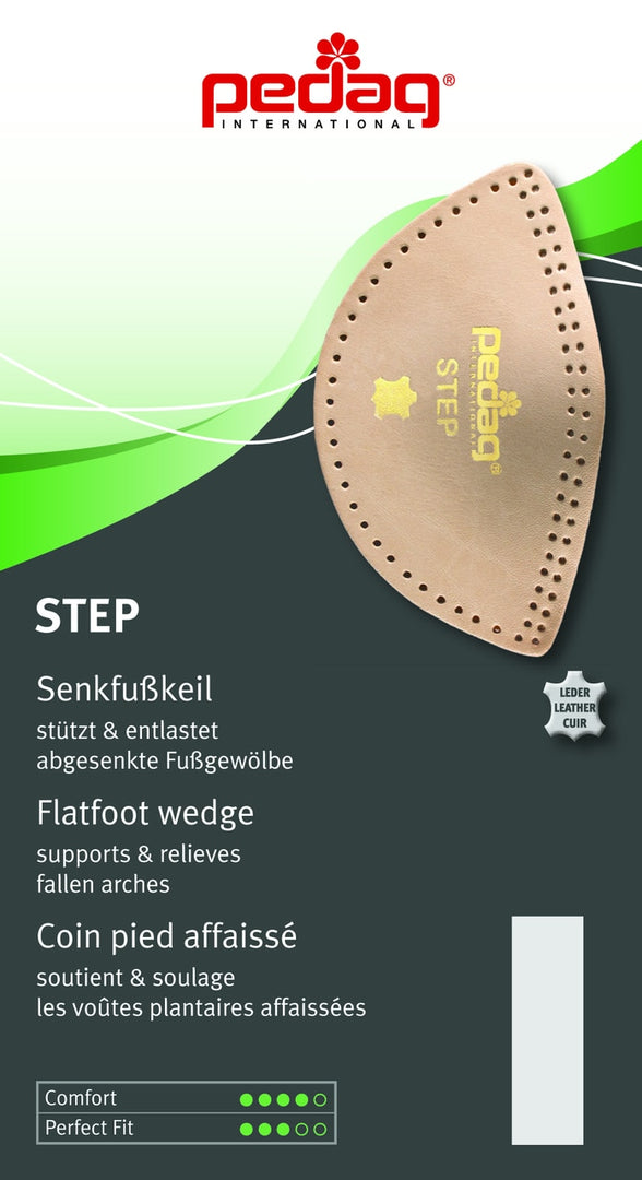 Pedag® STEP is a leather symmetrical shaped wedge support. German hand-made with elegant, durable, and high quality vegetable tanned leather. Pedag® STEP helps prevent further development of flatfoot. Provides proper support for the medial longitudinal arch. Shock absorbing moss rubber.